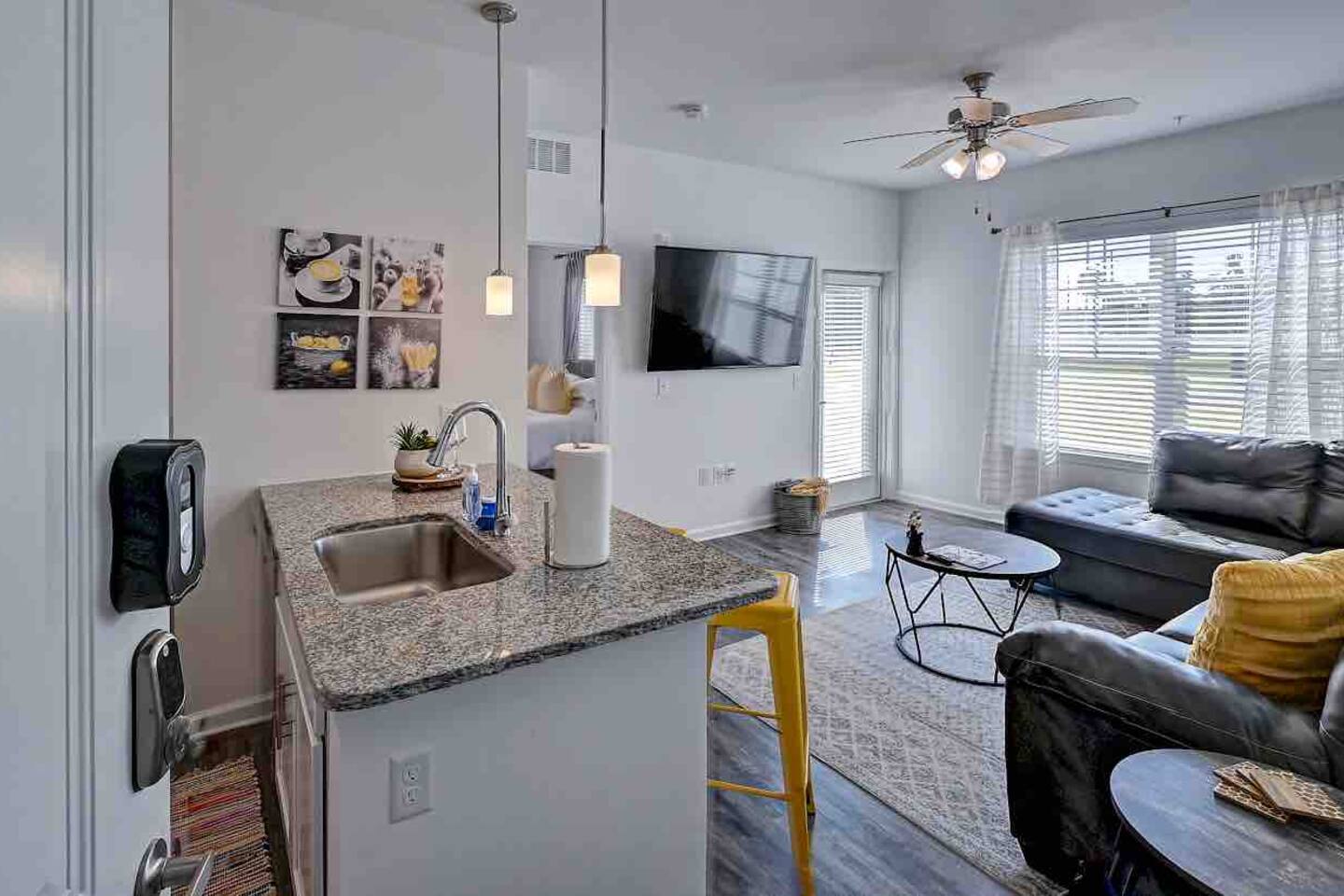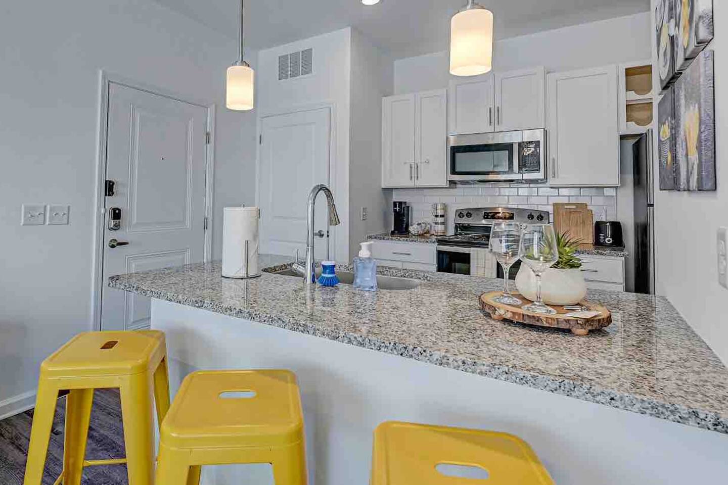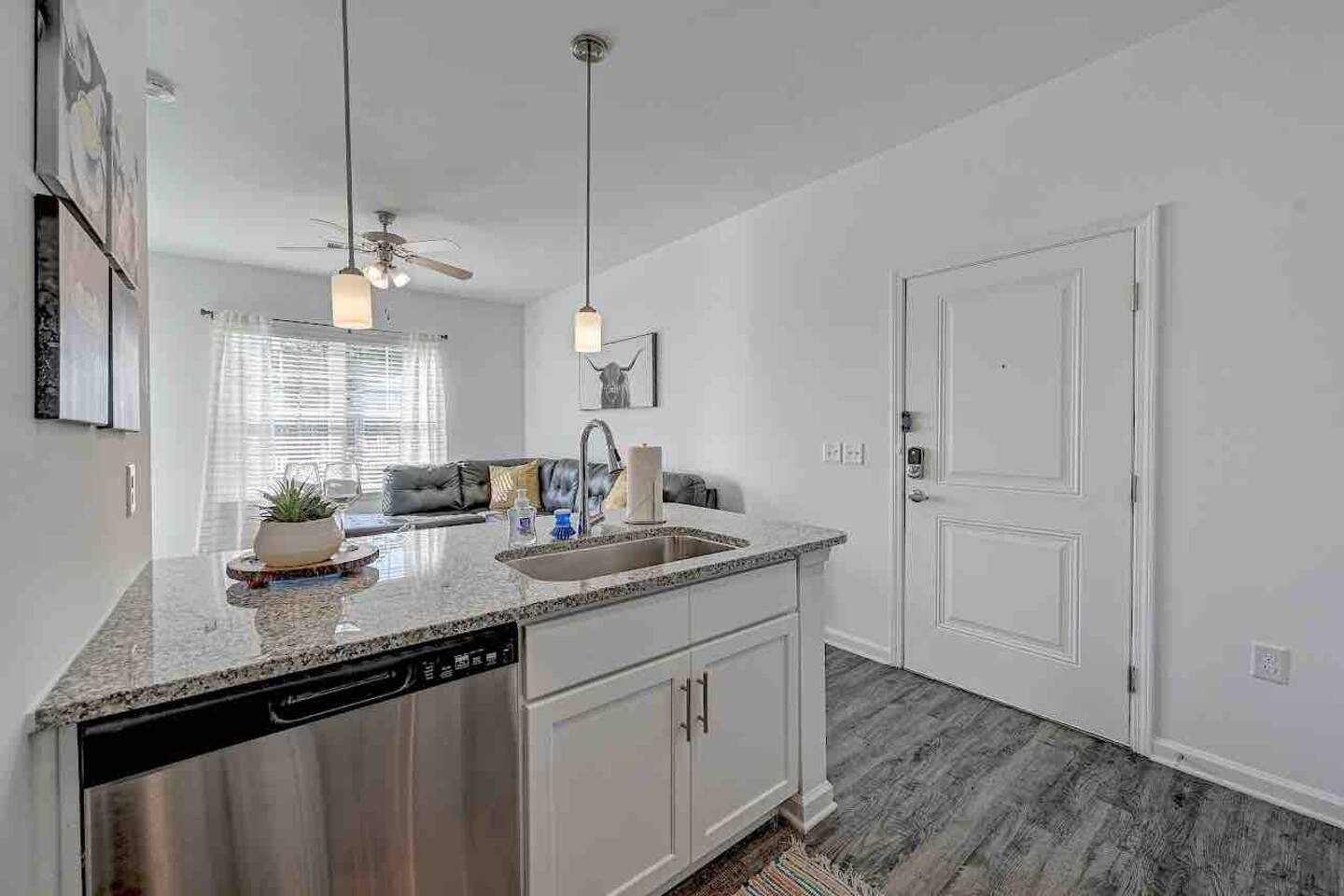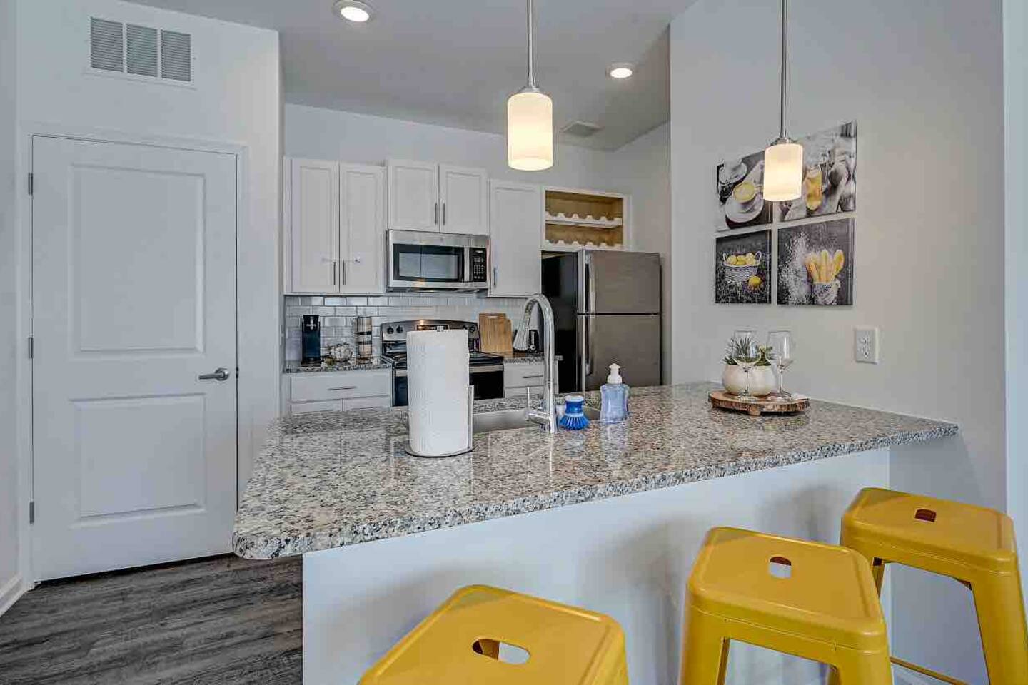 Relax and unwind in comfort! Apartment features all the amenities needed for your stay. Enjoy FREE UNLIMITED WiFi, 65" Smart TV, In Unit laundry and private balcony overlooking the resort style pool. Guest have access to the pool area, gym and enjoy FREE parking. Bedroom features 1 Queen Bed 2nd Bed: Queen Air Mattress Available Unit is located on the 1st Level