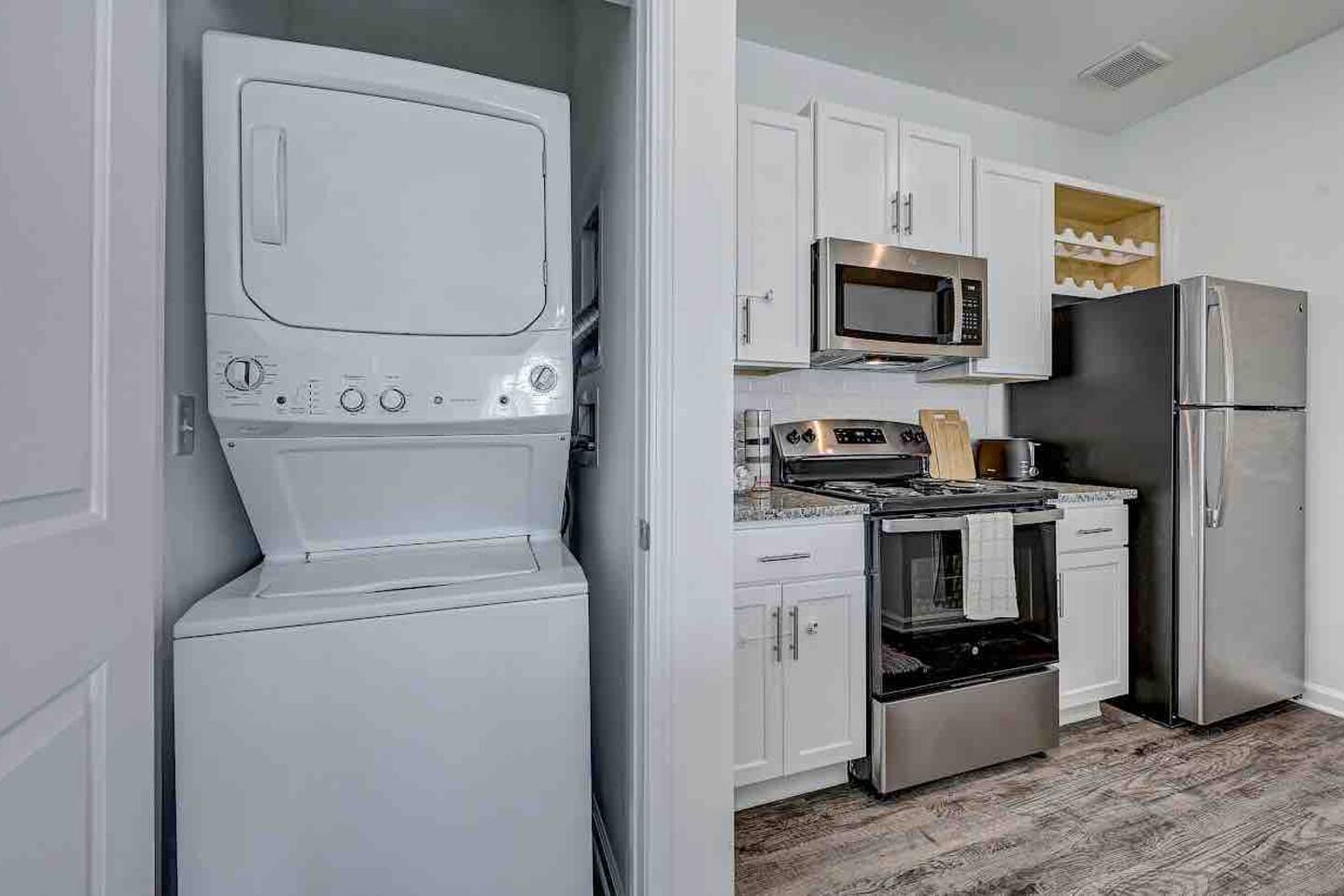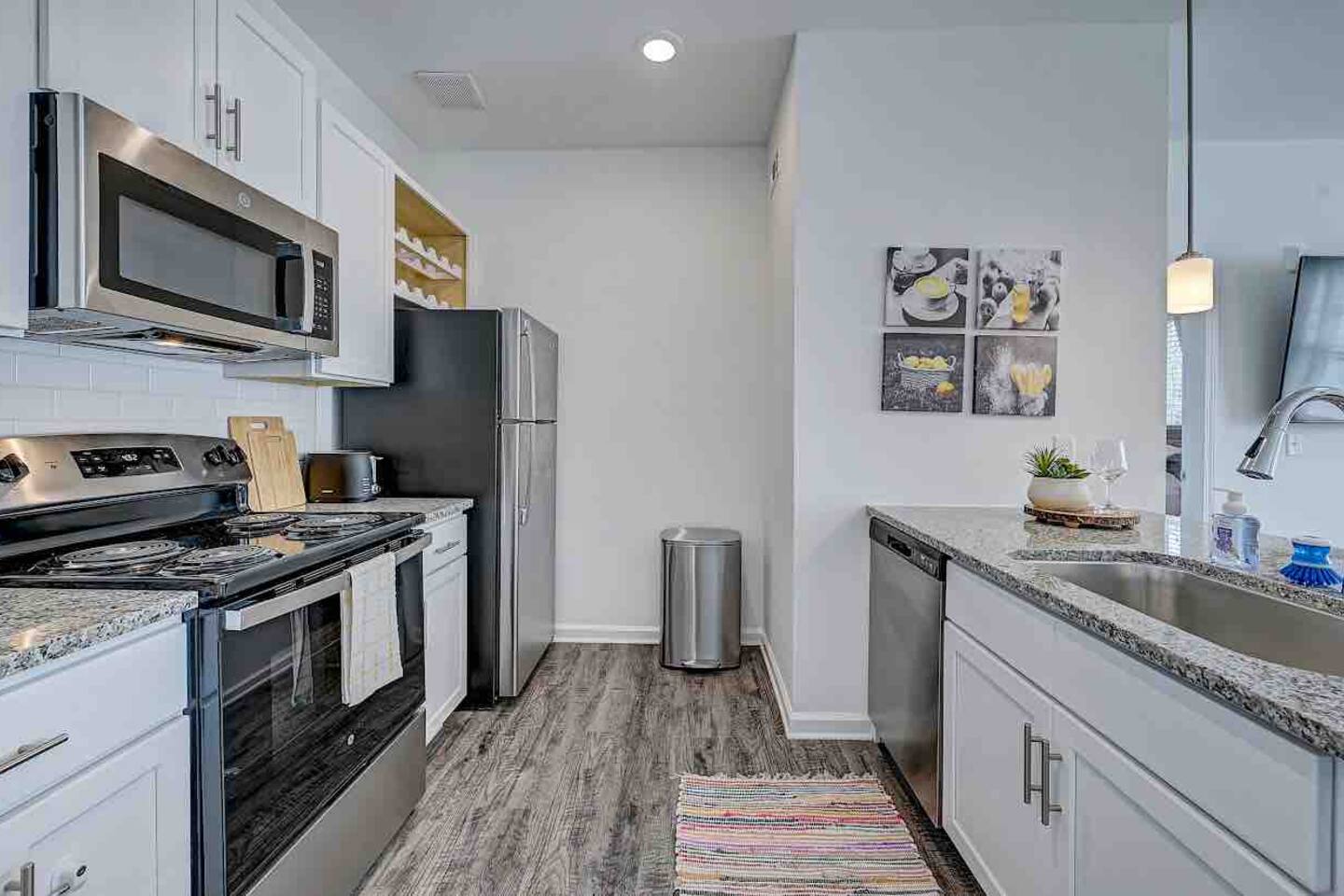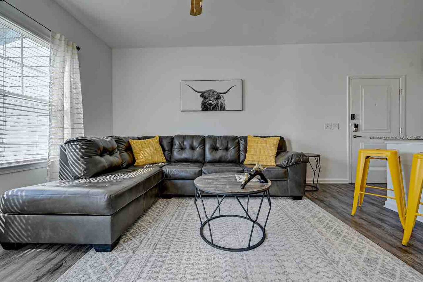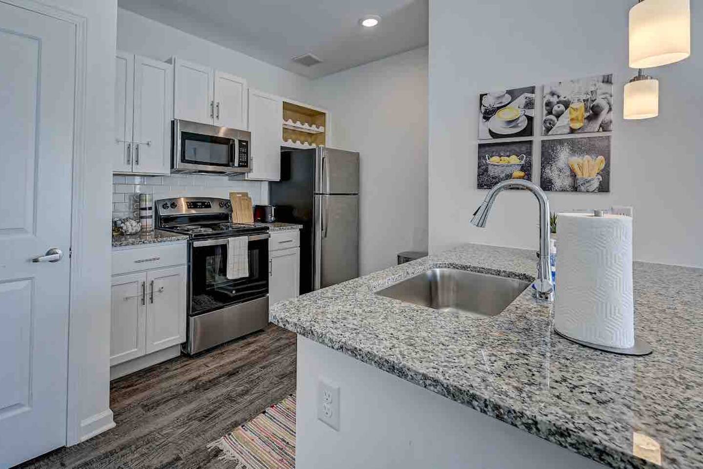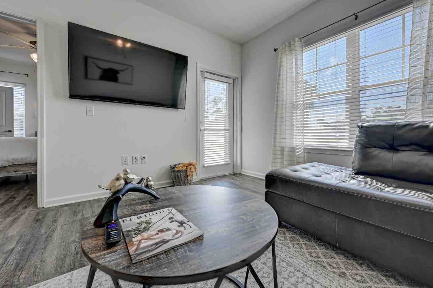 Relax and unwind in comfort! Apartment features all the amenities needed for your stay. Enjoy FREE UNLIMITED WiFi, 65" Smart TV, In Unit laundry and private balcony overlooking the resort style pool. Guest have access to the pool area, gym and enjoy FREE parking. Bedroom features 1 Queen Bed 2nd Bed: Queen Air Mattress Available Unit is located on the 1st Level