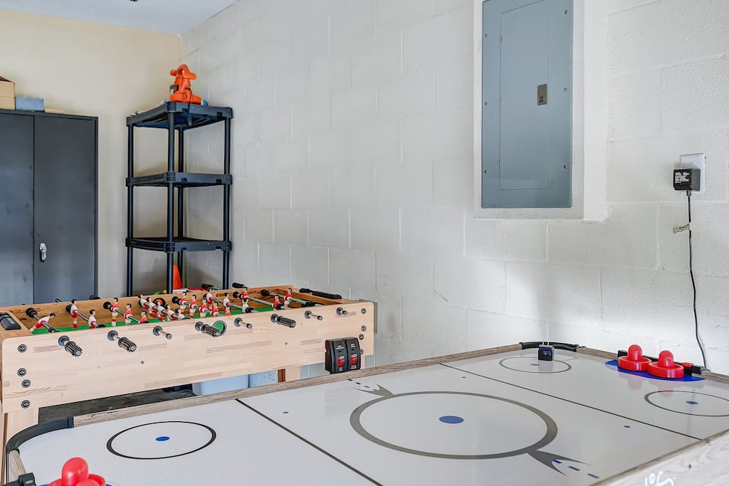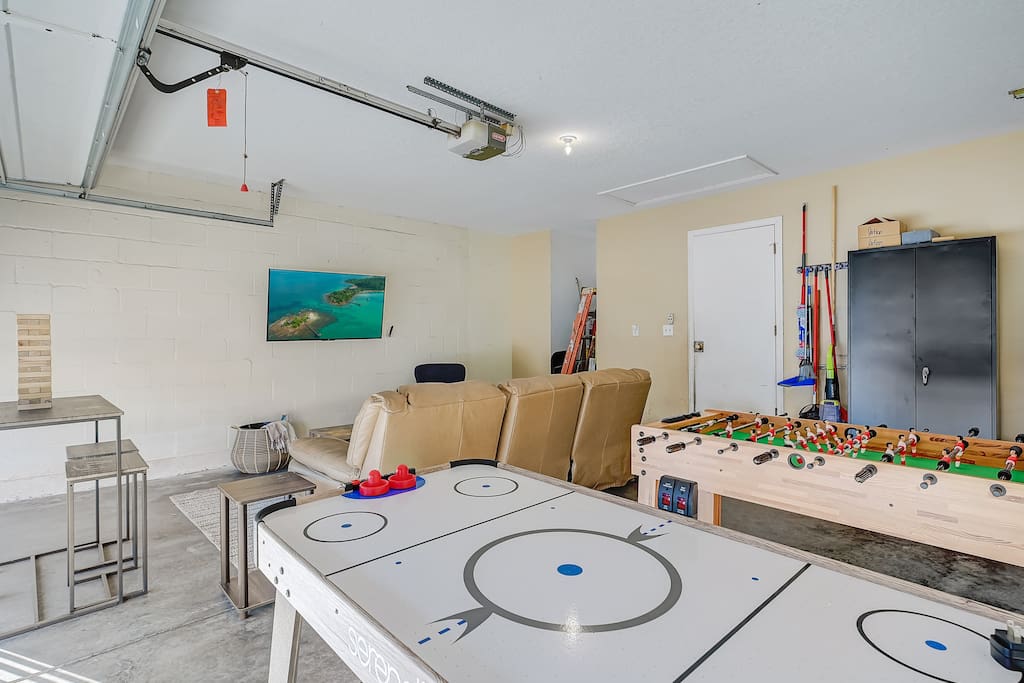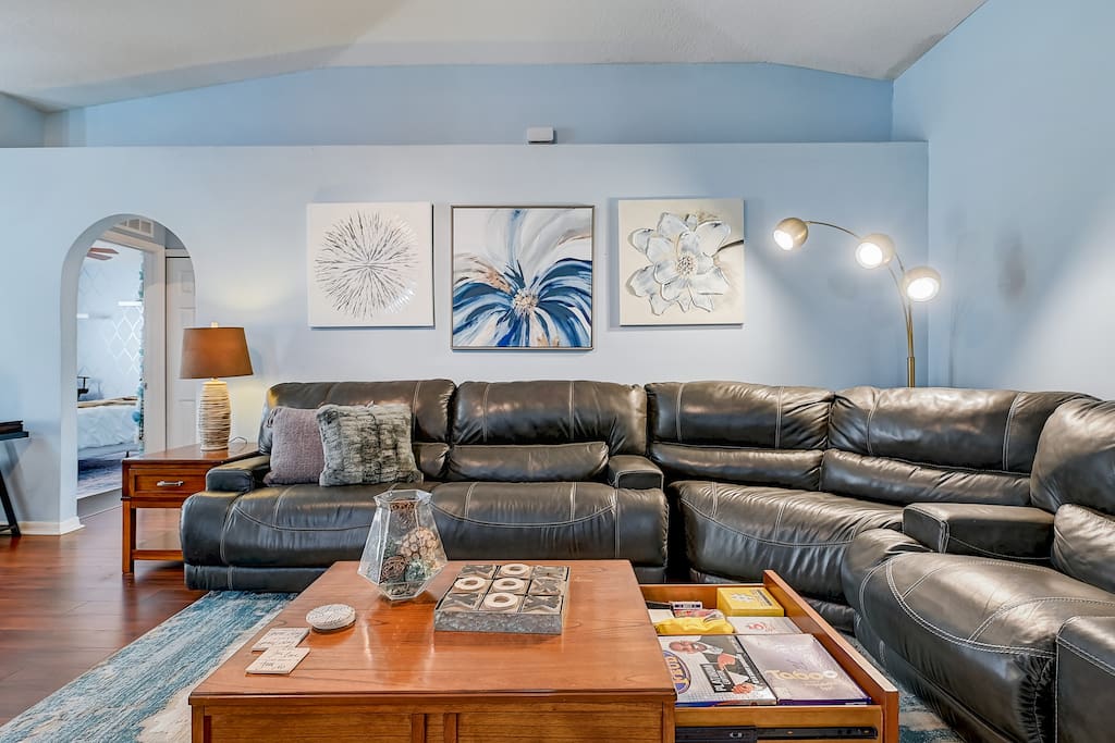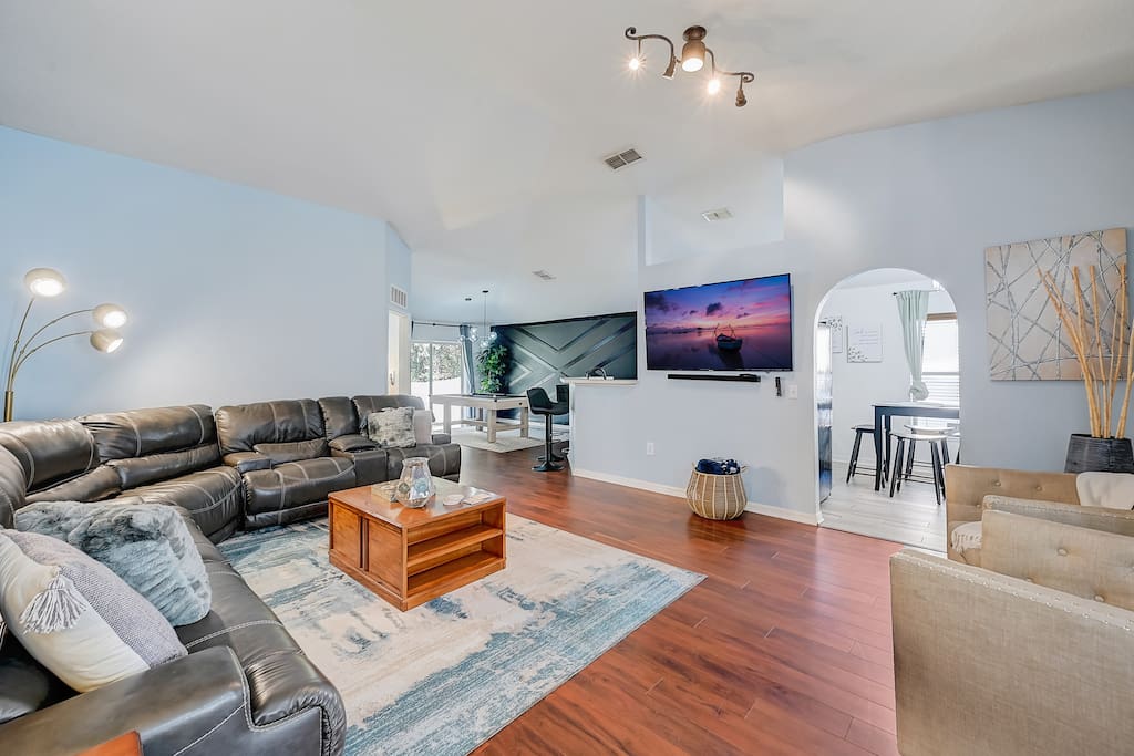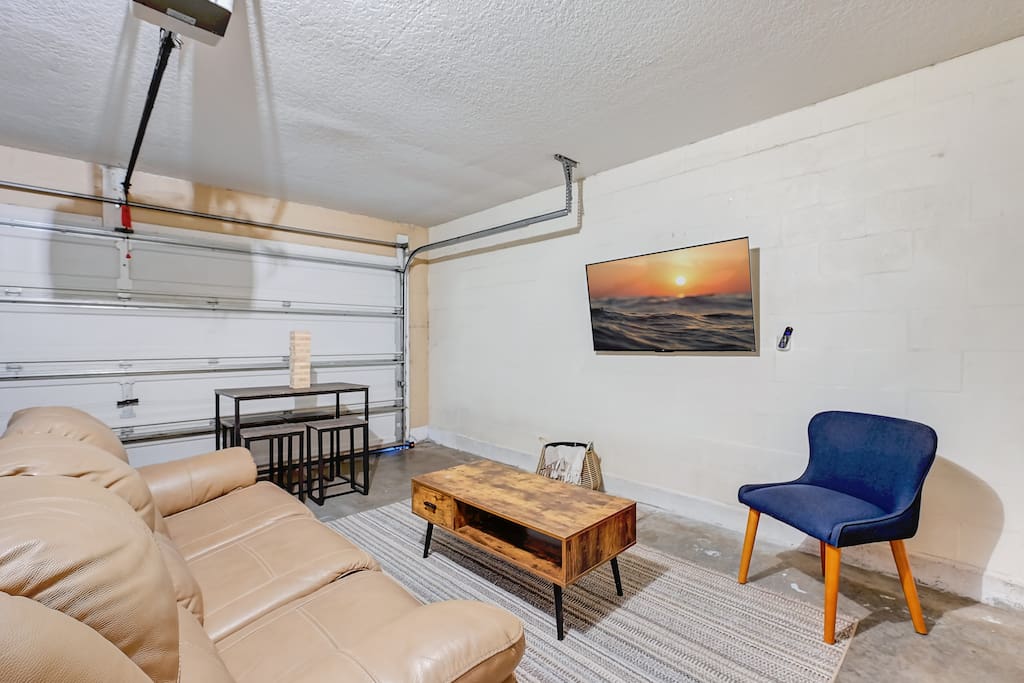 Relax and unwind in comfort! This spacious, open-concept home offers everything you need for a memorable stay. Featuring: Master Bedroom : 1 Queen Bed and ensuite master bathroom 2nd Bedroom : 1 Queen Bed 3rd Bedroom: 1 Queen Bed Double Queen Air mattress provided for additional sleeping arrangements Each bedroom includes a Smart TV for your entertainment. The living room is designed for cozy gatherings, with a luxurious leather sectional and a 65" Smart TV. Stay connected with FREE unlimited high-speed Wi-Fi and take advantage of the dedicated workspace for remote work or planning your adventures. The fully stocked kitchen makes meal prep a breeze, and in-unit laundry adds extra convenience. Step outside to your private oasis overlooking a beautiful forest line with a spacious backyard to enjoy. For added fun, the separate garage living space offers sitting area, Smart TV and games.
