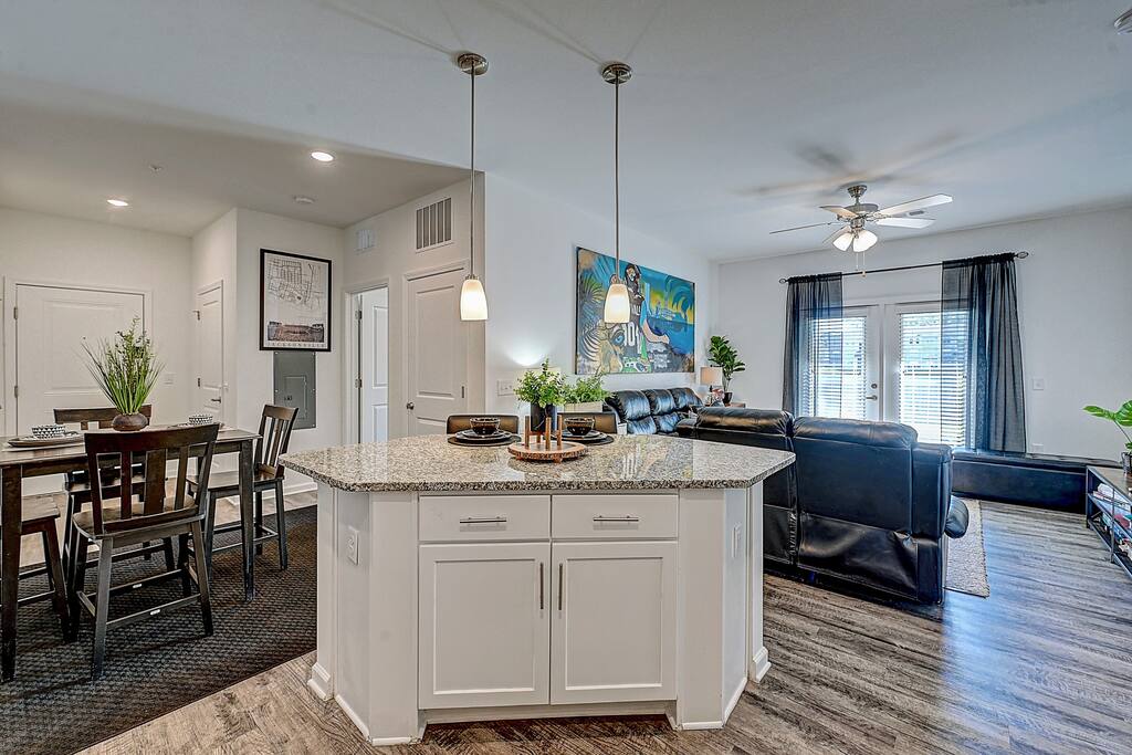 Unwind and Cheer the Jags on in Comfort! Apartment features all the amenities needed for your stay. Enjoy FREE & FAST UNLIMITED Wi-Fi, 75" Smart TV in living room & Smart TVs in bedrooms, In Unit laundry and relaxing balcony w/lake view. Guest will also have access to the shared pool area, gym and can enjoy FREE parking. Master Bedroom features 1 King Bed 2nd Bedroom feat. 2 Full Sized Beds Queen Air Mattress Available Laundry Room Two Full Baths in each room! Unit is located on 1st floor *Sofa Recliner Feature turned off. ***Not the listing for you? Check out our others listings by clicking the profile picture below.**