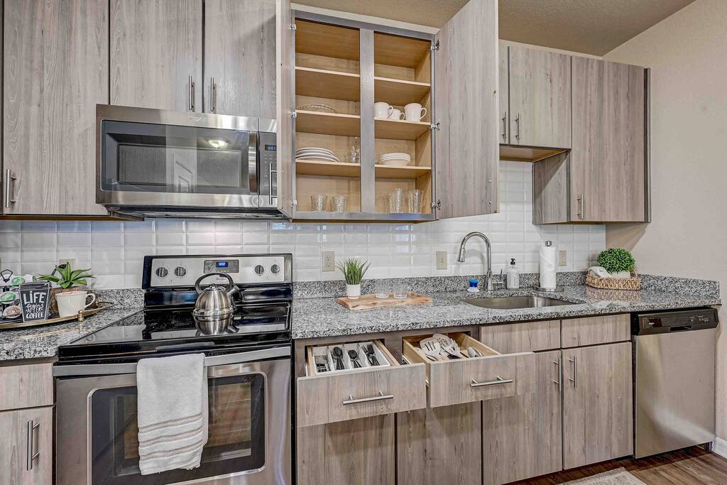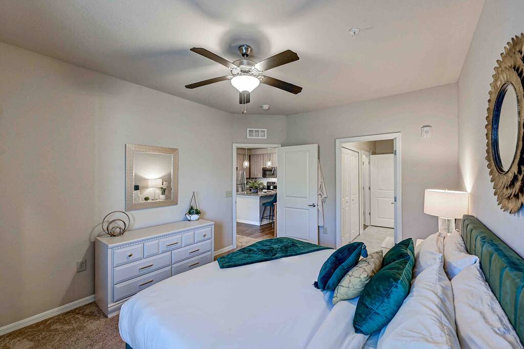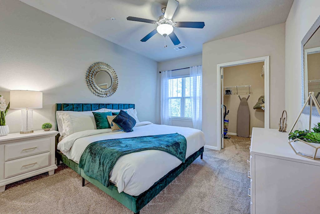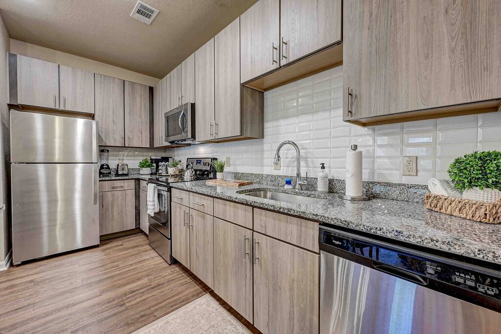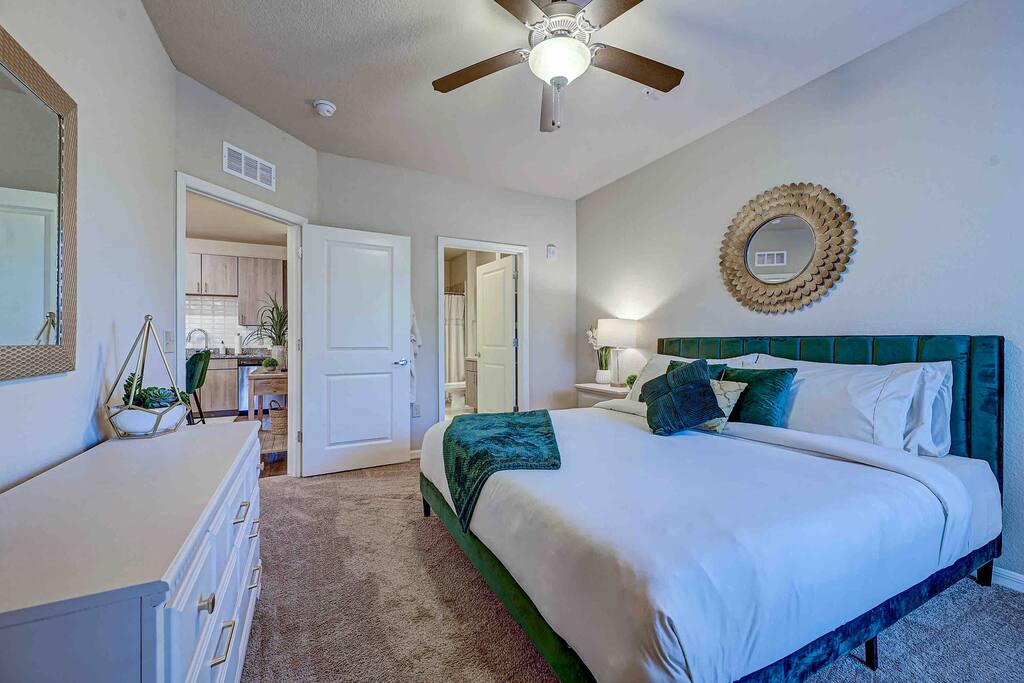 Relax and unwind in comfort! Apartment features all the amenities needed for your stay. Enjoy FREE UNLIMITED WiFi, 55" Smart TV, In Unit laundry and private balcony. Guest will also have access to the pool area, gym and enjoy FREE parking. Bedroom features 1 King Bed 2nd Bed: Queen Air Mattress Available Laundry Room Unit is located on the 3rd level, No Elevator ***Not the listing for you? Check out our others listings by clicking the profile picture below.***